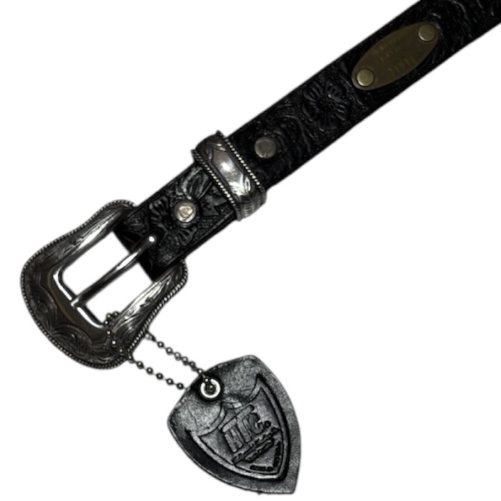HTC × GLADHAND / HTC - WESTERN BELT "EMBOSS FLOWER" / BLACK / ・デザイン 1inch巾のヴィンテージフラワーエンボス加工を施したモデル ・ディテール Western Buckleの脇にオリジナルDOG TAGがみえるのが特徴 ・サイズ 穴の数:5穴 {穴の間隔:約1inch} ・素材 肉厚なステアハイドを使用。フルベジタブルタンニン鞣しでオイル&グリースを染み込ませたオイルドレザーなので、長年使い込むとツヤが出て味わい深いエイジングが楽しむことができます。